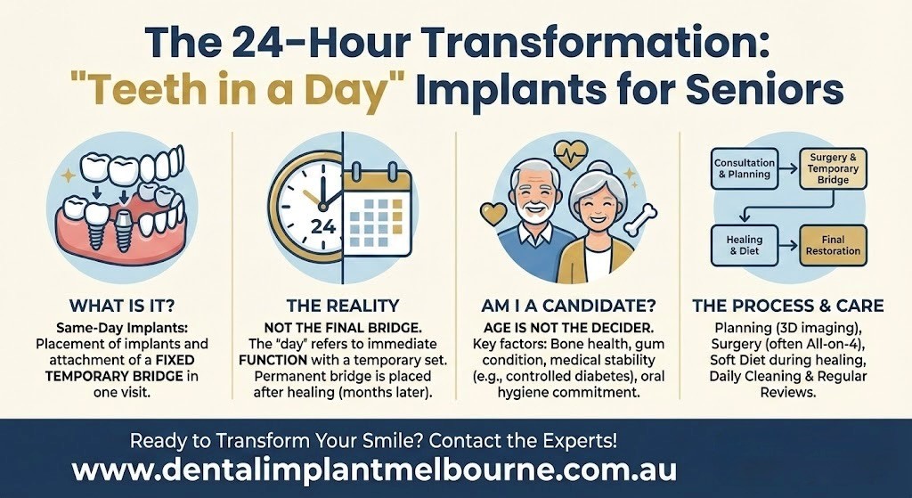 For many Australians, loose dentures or failing teeth make eating and speaking harder than they should be. “Teeth in a Day” places dental implants and attaches a fixed set of temporary teeth soon after, often on the same day. If you have been weighing up dental implants in Melbourne, this may be one option.